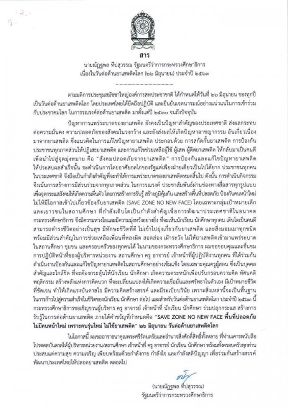 สารจากรัฐมนตรีว่าการกระทรวงศึกษาธิการ เนื่องในวันต่อต้านยาเสพติดโลก (26 มิถุนายน 2563)