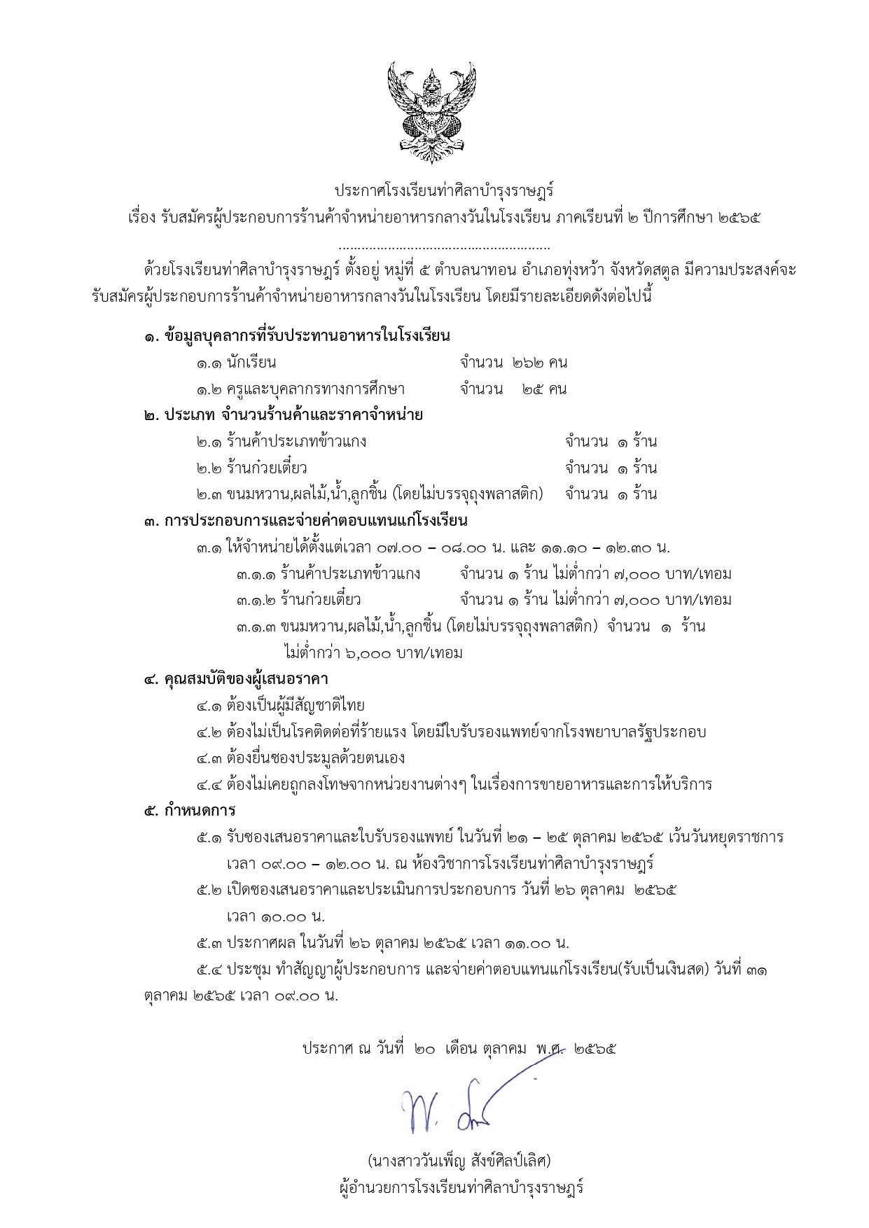 ประกาศรับสมัครผู้ประกอบการร้านค้าจำหน่ายอาหารกลางวันในโรงเรียน ภาคเรียนที่ 2 ปีการศึกษา 2565