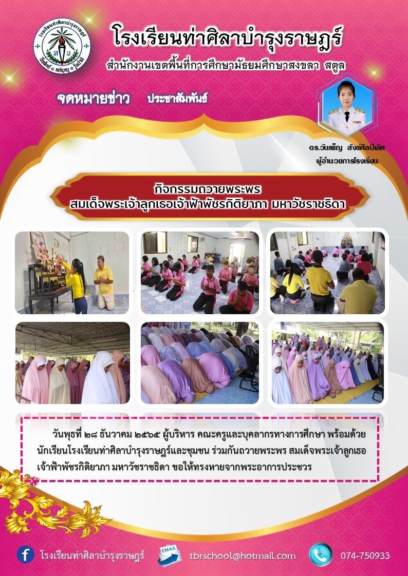 วันที่ 28 ธันวาคม 2565 จัดกิจกรรมถวายพระพร สมเด็จพระเจ้าลูกเธอเจ้าฟ้าพัชรกิติยาภา มหาวัชราชธิดา ขอให้ทรงหายจากอาการประชวร