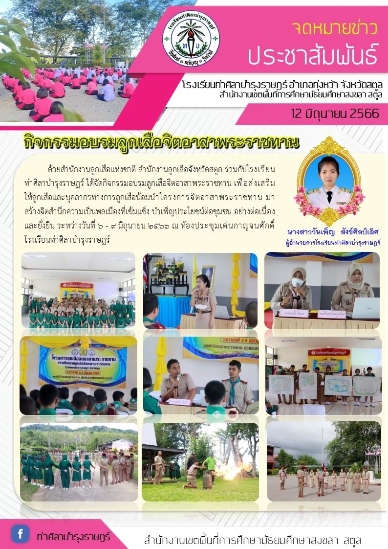 วันที่ 6-8 มิถุนายน 2566 จัดกิจกรรมอบรมลูกเสือจิตอาสาพระราชทาน ณ โรงเรียนท่าศิลาบำรุงราษฎร์