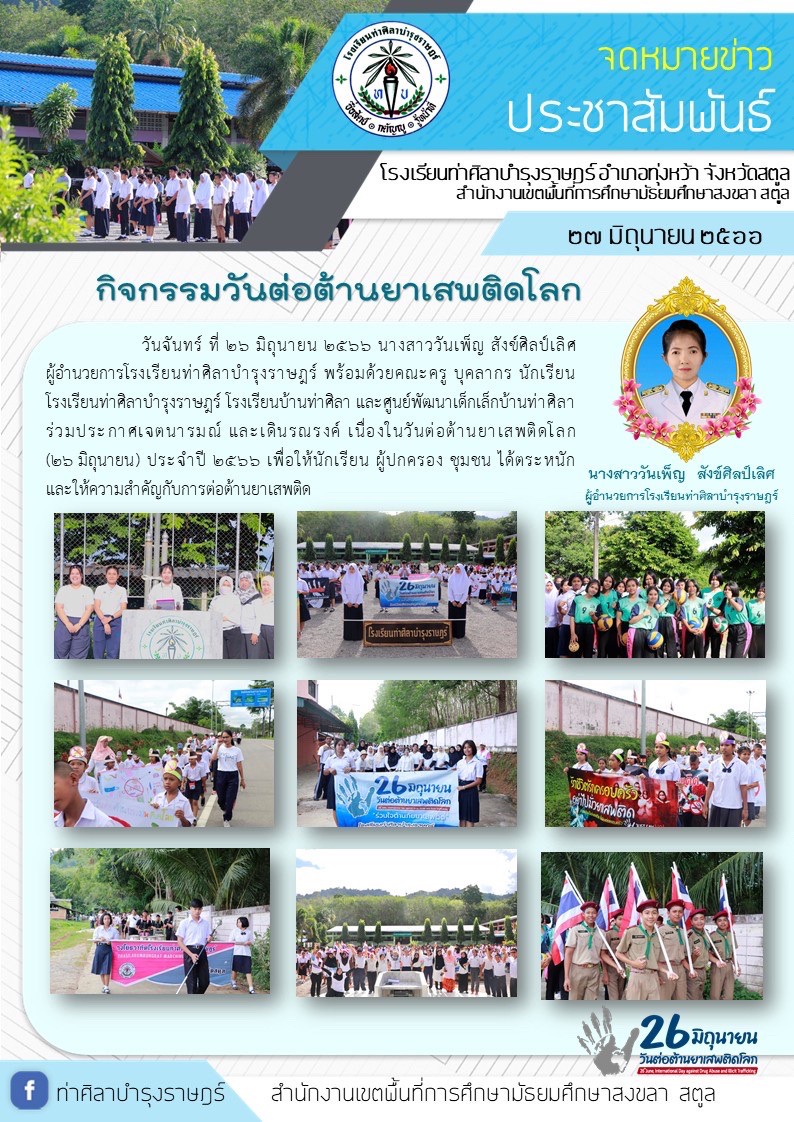 วันที่ 26 มิถุนายน 2566 กิจกรรมเดินรณรงค์เนื่องในวันต่อต้านยาเสพติดโลก