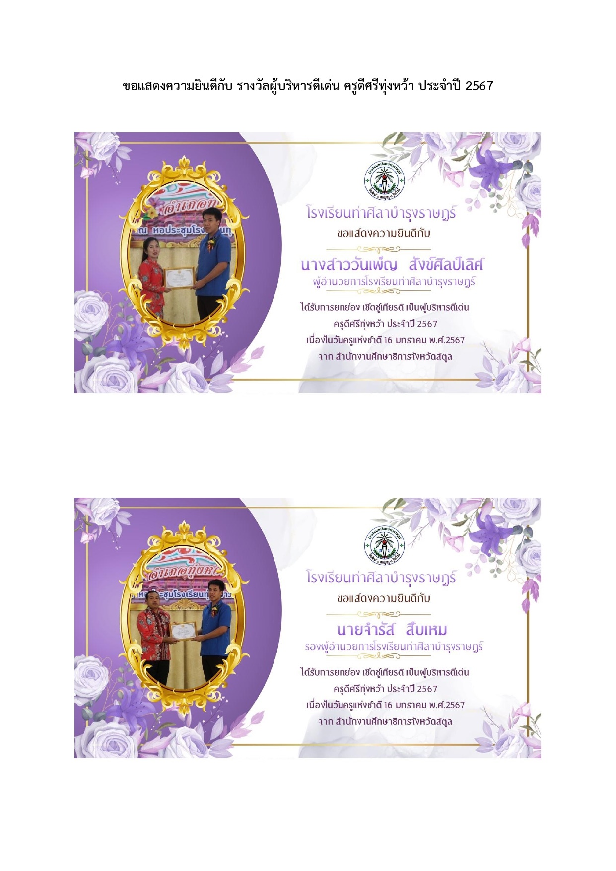ขอแสดงความยินดีกับผู้บริหารดีเด่น ครูดีศรีทุ่งหว้า ประจำปี 2567
